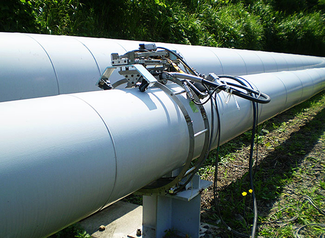 放射線源と半導体センサーを組合せ、装置を走行させながら、配管等の腐食を広範囲に検査できます。またプラントの操業中に、配管保温の上からの検査も可能です。