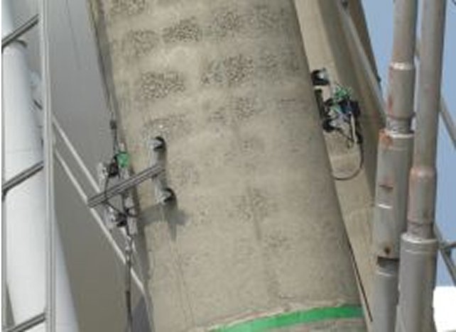 Thru-VUの応用技術で、足場架け等大がかりな付帯工事なしに、球形タンクの脚柱部の耐火材下腐食状況をγ線により短時間でモニタリング検査することが可能です。